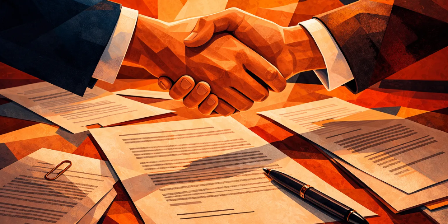A graphic of men's hands engaged in a handshake over a table of scattered contract pages and a pen