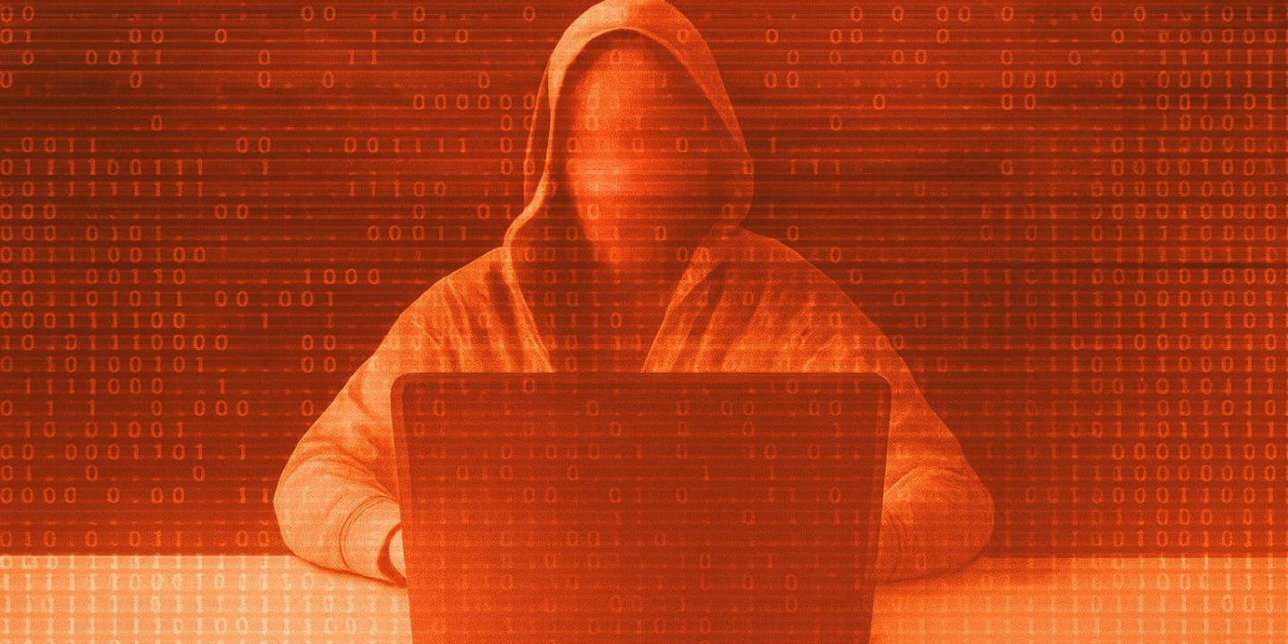 A hooded, faceless figure sits at a laptop surrounded by orange binary code, symbolizing digital impersonation and online art scams.