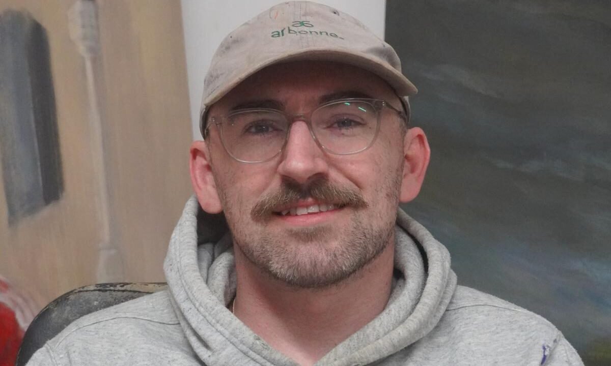 The exhibition features six oil paintings that examine themes of decline, failed institutions, and disillusionment in Scotland and the UK.