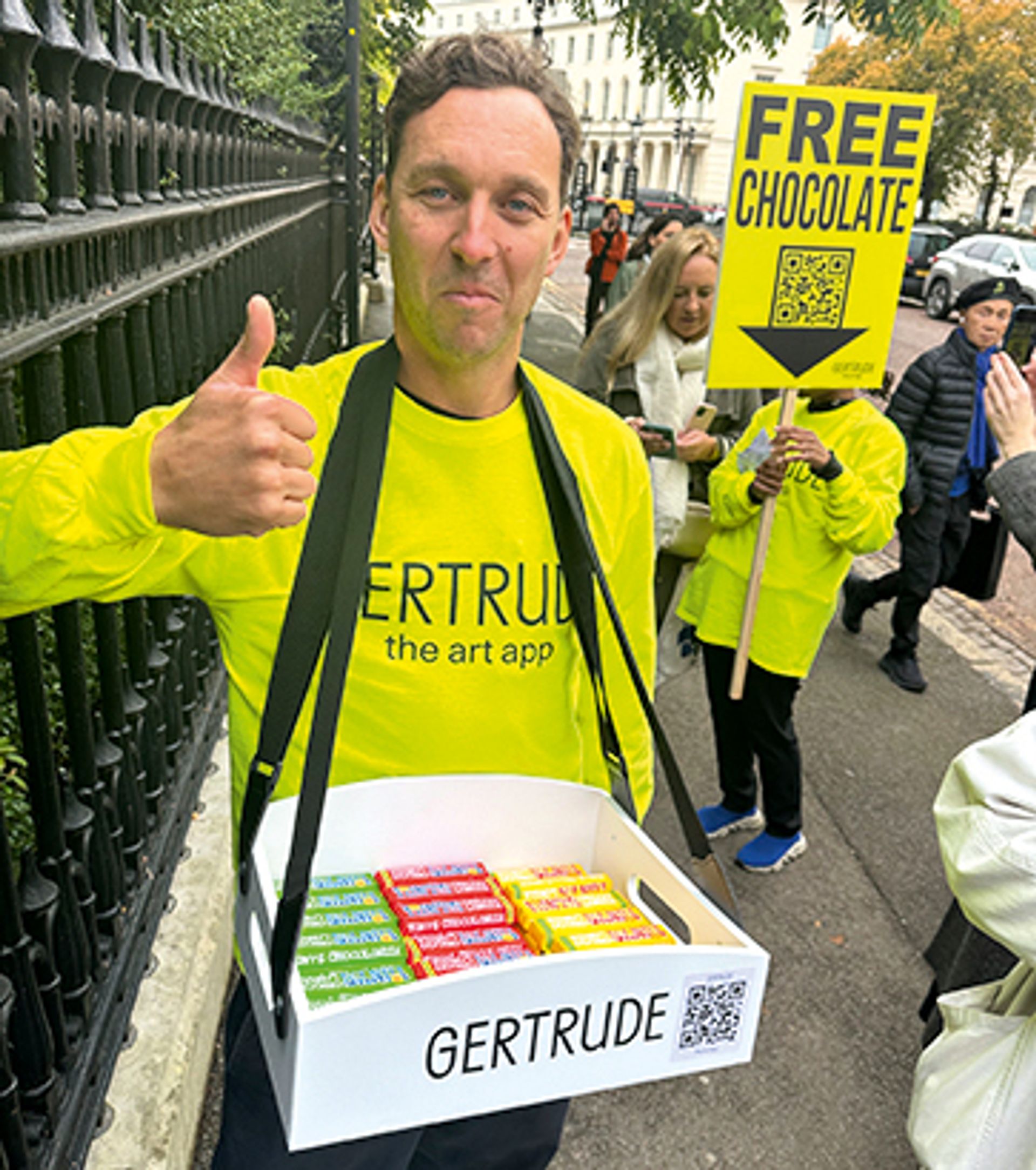 Chocoholics visiting Frieze London are in for a treat as staff from the art app Gertrude are handing out free Tony’s Chocolonely bars at the entrance—ideal for those with a sweet tooth heading to the fair. The confectionery stunt is a canny way of getting fairgoers to sign up to Gertrude, which is offering a special “Frieze week survival guide” in partnership with ArtReview. Will Jarvis, the company’s chief executive, was on hand dishing out the choccie bars, ironically quipping: “Two years ago [with The Sunday Painter gallery], I was giving Will Smith a private tour of Frieze—now, I’m doing this.” His efforts were paying off though, as scores of people signed up (with most opting for the dark chocolate). Thumbs up.