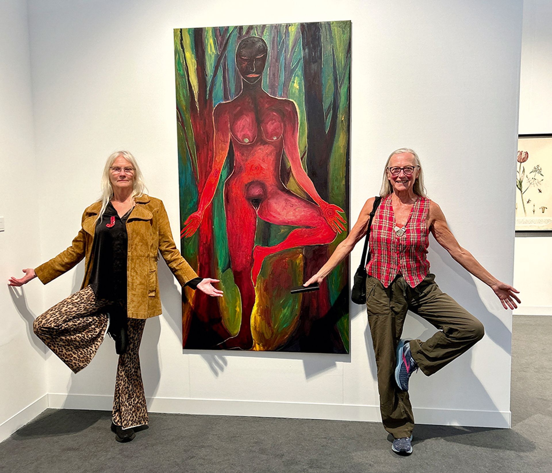 To celebrate her Frieze debut along with her recent signing by Richard Saltoun Gallery, Jennifer Binnie was joined by her fellow Neo Naturist sister Christine Binnie on the gallery’s stand as the two echoed the yoga pose of the female figure in Jennifer’s dramatic new painting, Tree. “We’ve all been doing the tree together since 1982, so it’s nice to come full circle and take a bit of live yoga to Frieze,” says Wilma Johnson, the third founder of the Neo Naturist group. Unlike most of the trio’s performances, most notably their most recent one at Tate Britain’s Women in Revolt exhibition, this one was enacted fully clad.
