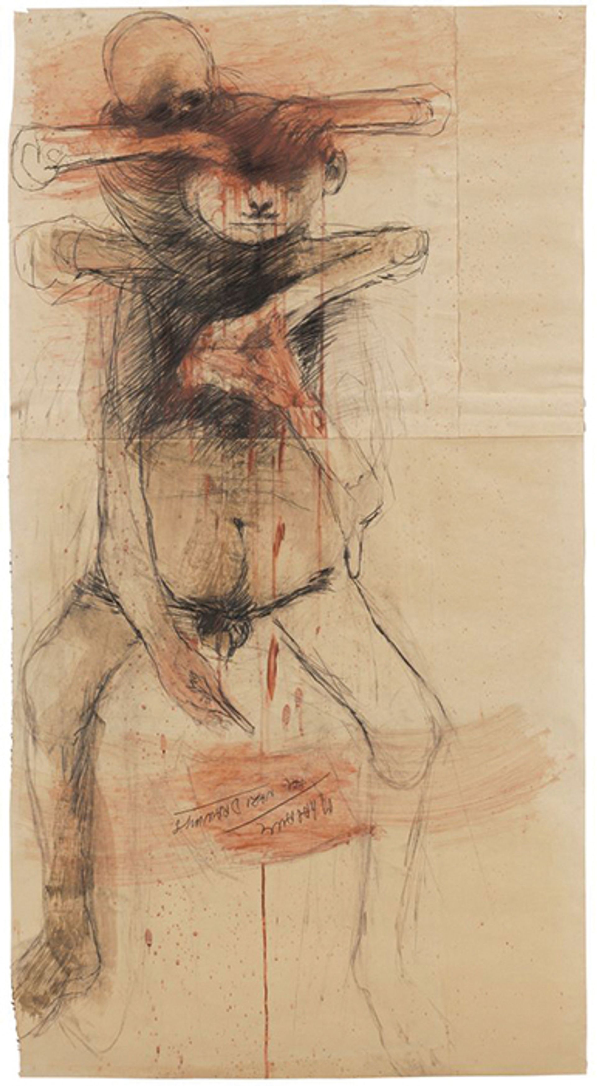 “I was full of hate, poison, and I wanted to spit it out,” said Lasansky of his 33 drawings on the horrors of the Holocaust. The son of Lithuanian Jewish immigrants in Argentina, he began the series in 1961, when the Nazi official Adolf Eichmann went on trial for war crimes in Israel and the testimonies of Holocaust survivors were broadcast to the world. He worked for six years on the initial group of 30 drawings, filled with skulls, skeletons and tortured bodies at life-size or larger. While the drawings were on tour in 1967-70, he also created an enormous collage triptych.