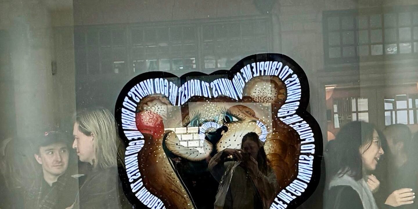Wolfson’s decision seemed a bit bratty to me, but he’s certainly not wrong about viewing art at openings. I did eventually wedge my way inside to see Mirror and Bear. It’s a painted wall work with a mirror at its center and a ticker-tape-like digital feed circulating around it that offers very Wolfson-y lines like “GOD WANTS TO CRIPPLE ME,” “GOD WANTS TO MOLEST ME,” and so forth. Coles was gazing at the work at the same time. “It’s a really surprising piece, because normally with Jordan’s two-dimensional works, you expect them to be silkscreened on metal, but this one is so beautifully painted in a folky style.”