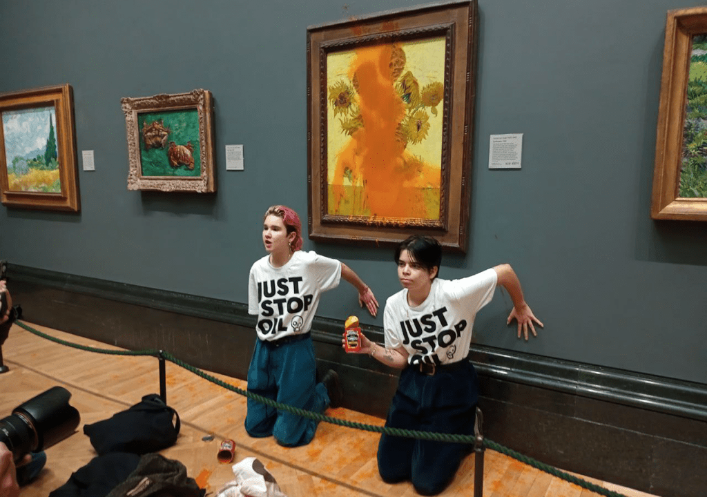 The same museum was the subject of a protest on September 27, when three activists with Just Stop Oil threw cans of Heinz tomato soup at a Vincent van Gogh painting of sunflowers. The incident occurred an hour after two other members of the group were sentenced to prison for a similar protest involving Sunflowers in 2022.