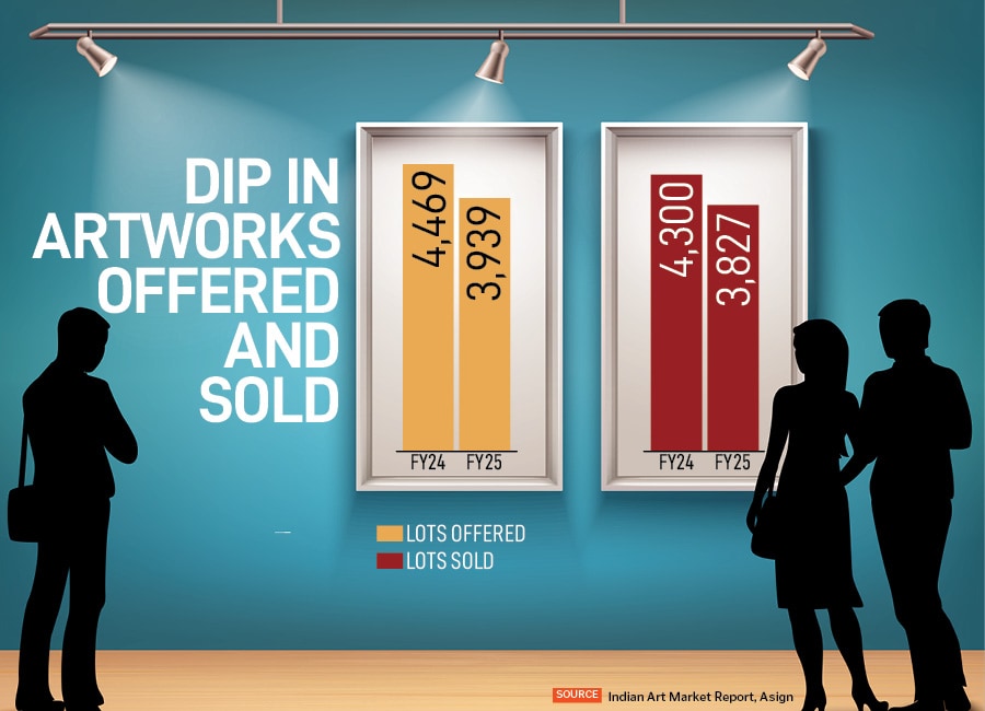 The number of artworks offered in auctions has dipped to 3,939 in FY25, down from 4,469 in the previous fiscal year. This led to a corresponding drop in the number of lots sold, from 4,300 to 3,827, in the same period. The report attributes this to a reduction in the availability artworks due to an increasing number of art fairs (domestic and international), exhibitions and biennales through FY25, which have likely diverted a significant number of works from the auction circuit.