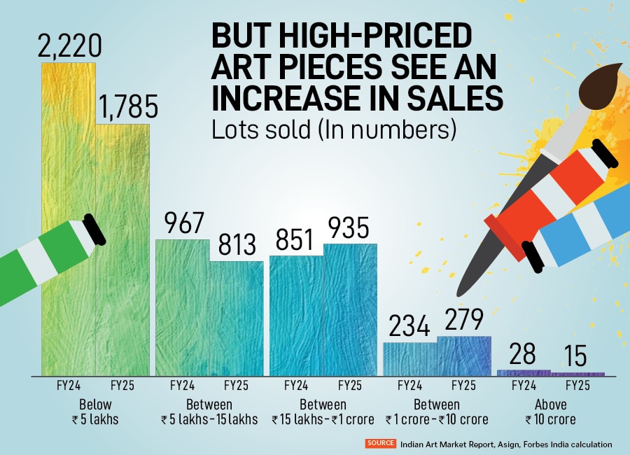 Conversely, the mid-to-high-priced segments showed some growth. Sales of artworks priced between ₹15 lakh and ₹1 crore saw an increase, rising from 851 lots to 935. The most significant jump was in the ₹1 crore to ₹10 crore category, where the number of sold lots climbed to 279 from 234, showing a 19 percent increase.