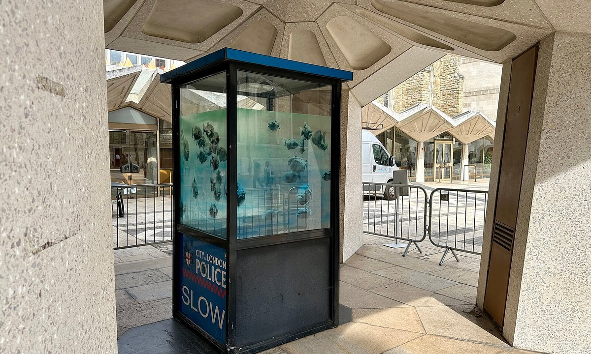 The fishy work forms part of an animal themed series by the elusive street artist that appeared across London last summer. The sentry box initially stood on Ludgate Hill near the Old Bailey, but following Banksy’s intervention, the police moved the glass-panelled box to Guildhall Yard, an outdoor square in the City of London.