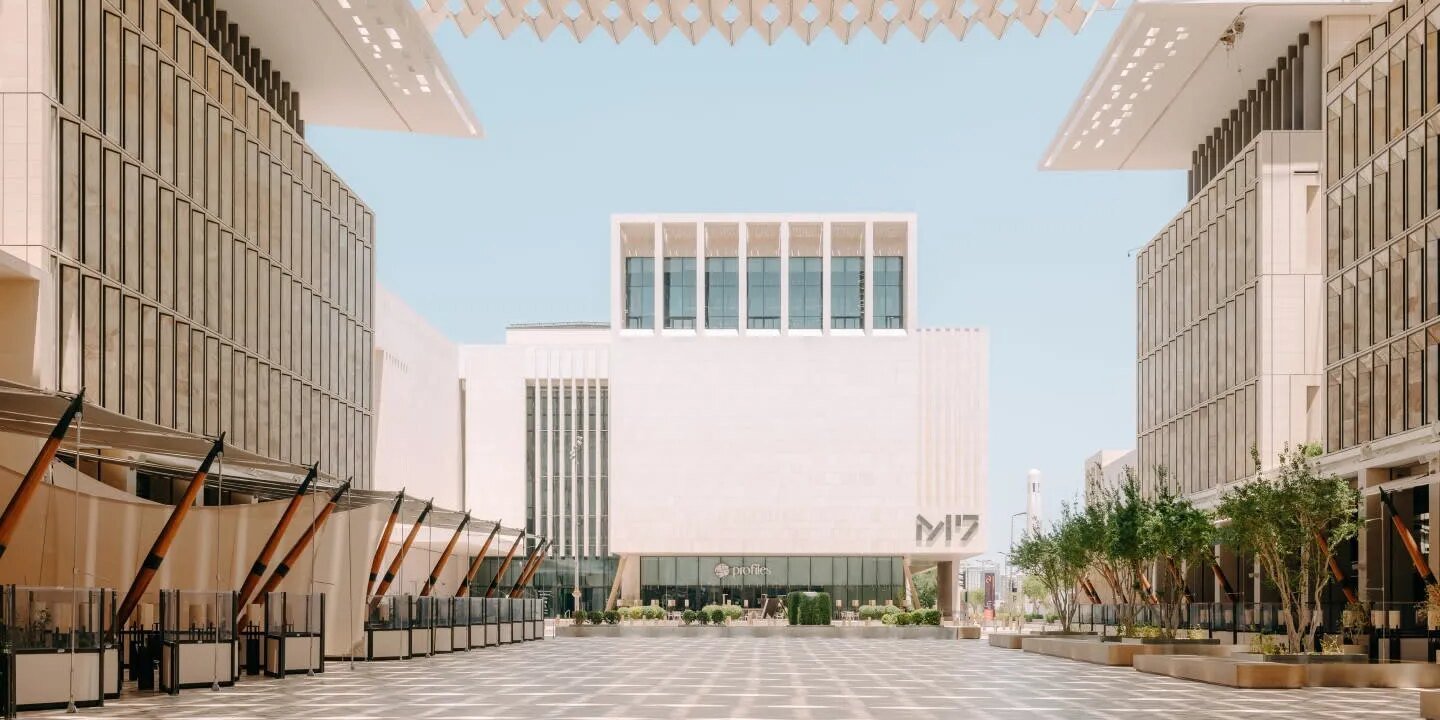 An exterior view of M7 in Doha, showing a wide sunlit plaza lined with modern beige buildings and geometric shading panels above.