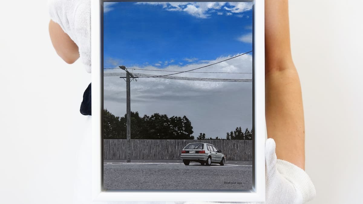 Dunedin artist Elliot Love’s ability to blend meticulous detail with storytelling has secured his place as a distinctive voice in contemporary New Zealand art. Despite their small scale format, there is often a cinematic quality to his quietly observed urban tableaus depicting cars from the mid-20th century, set within still urban landscapes.