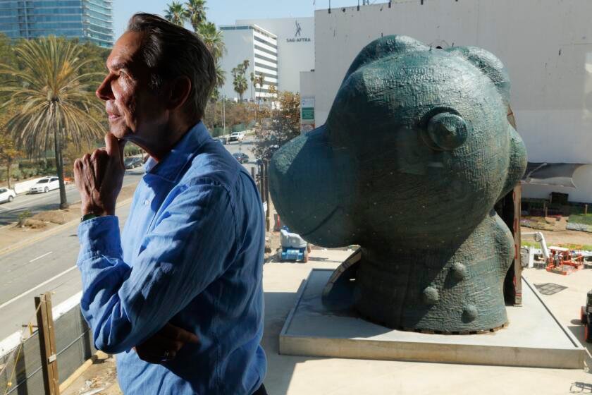 The sculpture contributes to an otherworldly environment in its current position, Govan said. It peers across the street at the bubbling La Brea Tar Pits with their fiber-glass mammoths and saber-tooth cats. It’s easy to imagine Hollywood one day making an apocalyptic film that features the abandoned landscape with only these museum relics still standing — and “Split-Rocker” erupting in explosive, unkempt flowers. The idea makes Koons smile, his blue eyes twinkling.