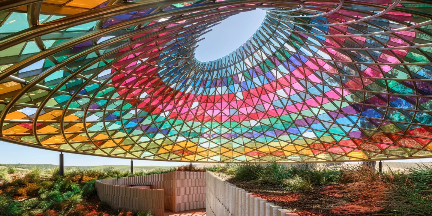 Just outside, Mikado Tree by Pascale Marthine Tayou rises from the landscape. Another signature site on the property is the Vertical Panorama Pavilion, conceived by Olafur Eliasson’s studio in collaboration with architect Sebastian Behmann. An immersive architectural and emotional experience, the rainbow-hued structure functions as a multisensory instrument—inviting visitors to reconnect with nature and recalibrate to its rhythms. Its conical canopy acts as a kind of calendar, centered on a north-facing oculus and glazed with 832 laminated glass panels in varying hues. Each panel corresponds to data gathered at the estate by Eliasson’s design studio, representing annual averages of solar radiation, wind intensity, temperature and humidity.