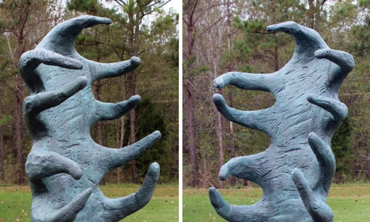 A sculpture that, in Tim Burton’s film Beetlejuice (1988), comes to life and attacks its maker, fictional artist Delia Deetz (Catherine O’Hara), is on the move yet again. The sculpture—an abstract form reminiscent of a windblown tree or nine-fingered hand standing atop a cubic plinth—has been stolen from the set of Beetlejuice 2 in Vermont.